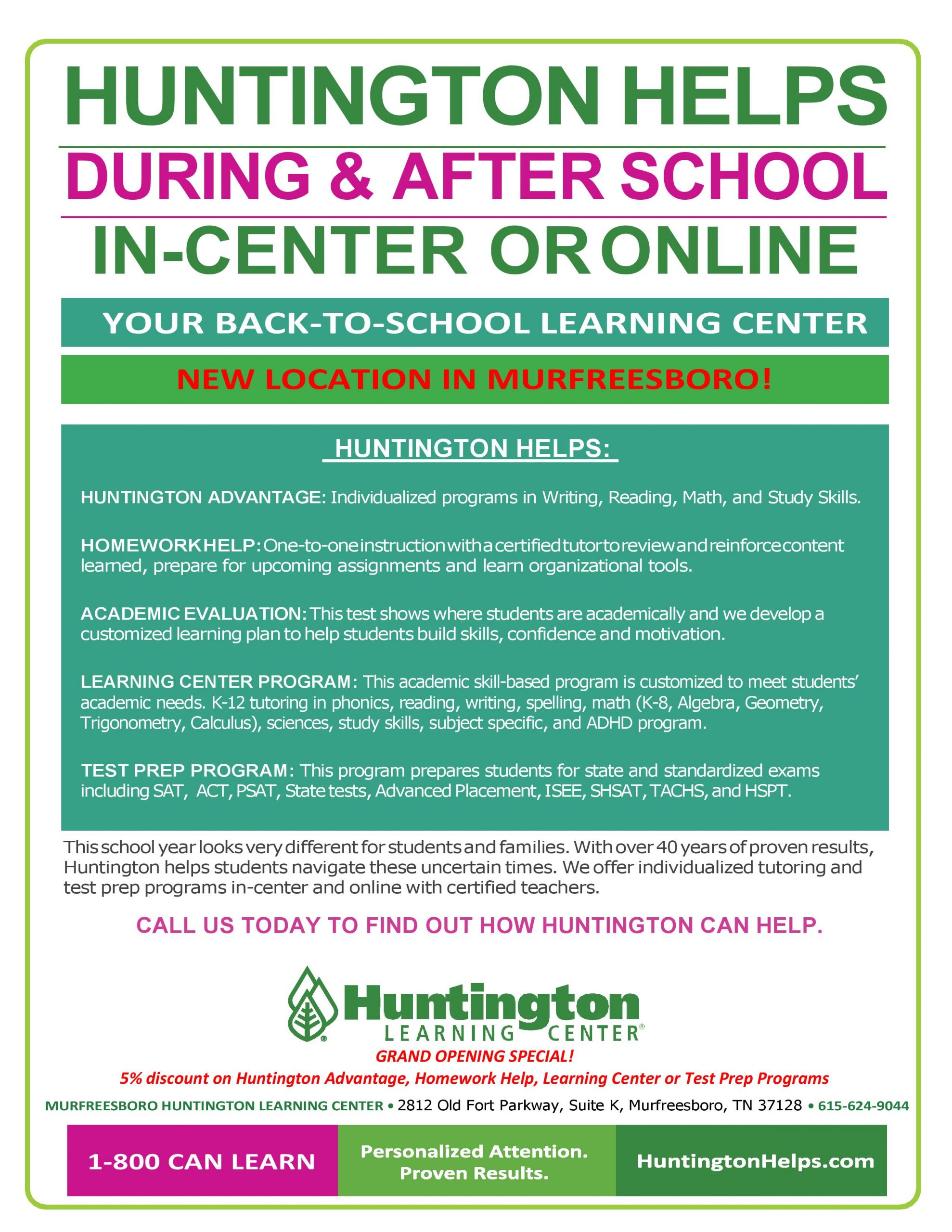 Huntington Learning Center has opened a brand new center in Murfreesboro on July 27. The Murfreesboro center is located at 2812 Old Fort Parkway, Suite K, Murfreesboro, TN 37128. Huntington Learning Center of Murfreesboro will offer personalized instruction to students from kindergarten through 12th grade to help them improve their grades, test scores, and confidence in math, reading, phonics, writing, science, and study skills. The center will also offer preparation for the ACT and SAT, as well as state and standardized exams. The center will follow all local and state government laws and CDC guidelines. For more information about the Murfreesboro Huntington or to schedule an appointment, call 615-624-9033 or visit huntingtonhelps.com/center/murfreesboro-tn.